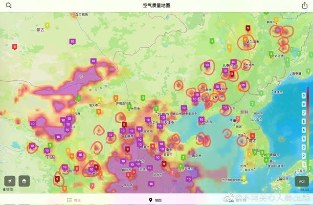 关于“雾霾”,人们应该思考的另一个特征是,为什么“空气质量地图”上的污染程度分布,除了长江中下游地区是连成一大片之外,其它地区都是呈点状分布的。而且每个城市的中心是浓度最高的点,然后向周围逐渐减弱,郊区的地方却没有污染。见图 1 中我圈起来的地方。图 2 也是一样,可以自己观察。