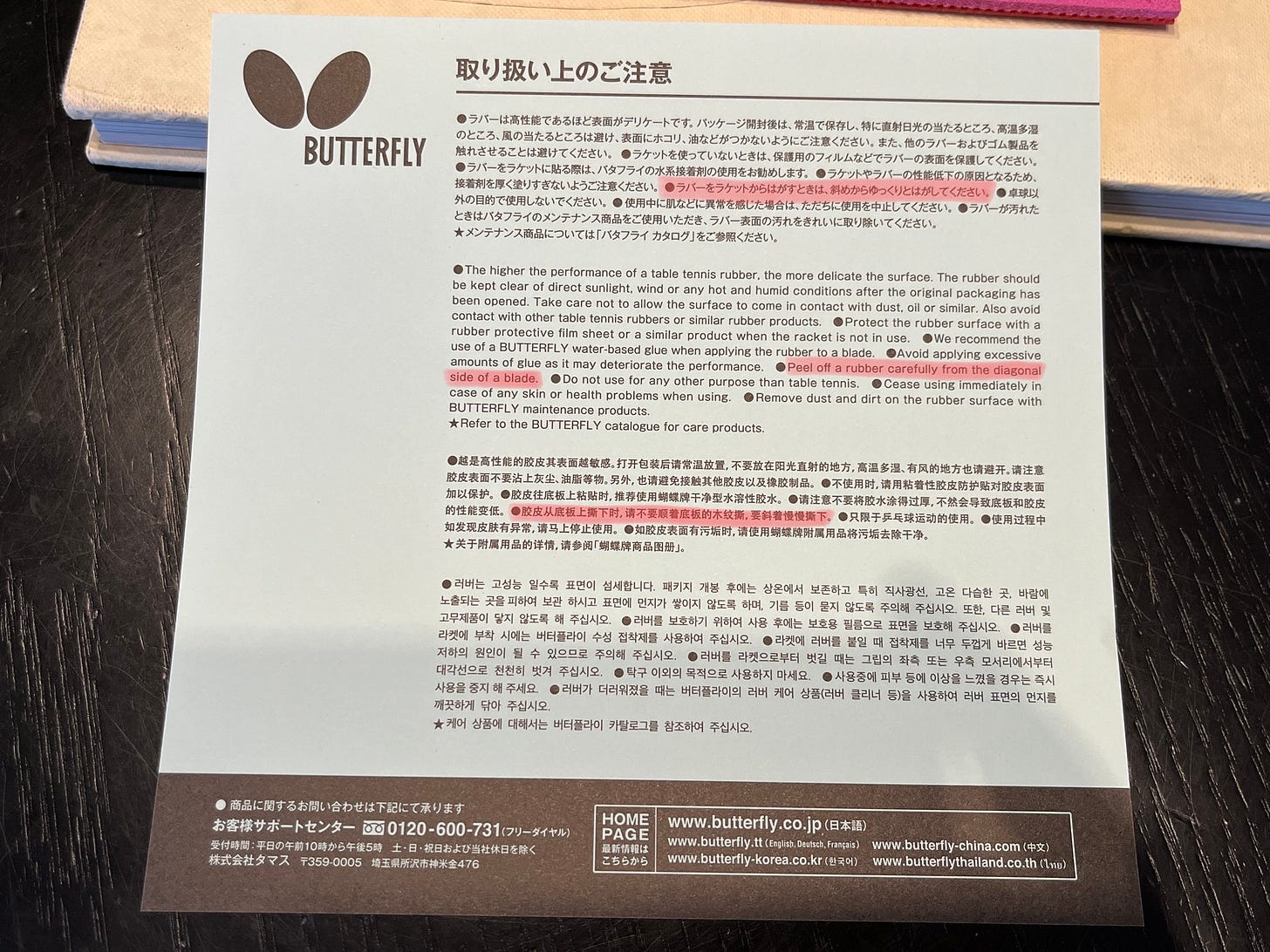 比如,这个 Butterfly 的乒乓球胶皮说明书告诉你:“胶皮从底板上撕下时,请不要顺着底板的木纹撕,要斜着慢慢撕下。”