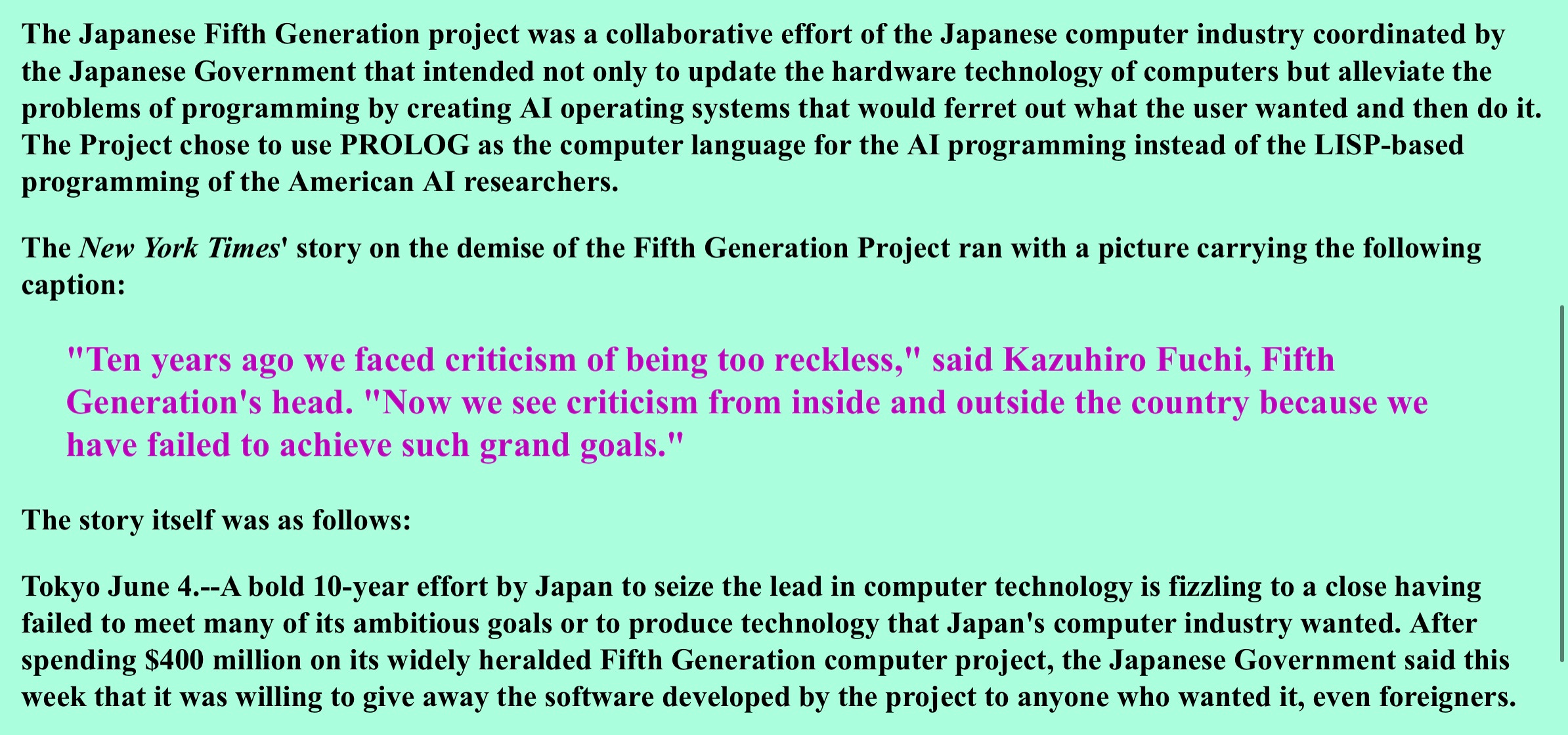 之前那篇关于人工智能的文章《人工智能的局限性》 里面,有一段关于 Prolog 语言的叙述。很多年轻一代可能还不知道,这上一次“AI 热”,与之相关的 Prolog 语言,跟日本很有关系。