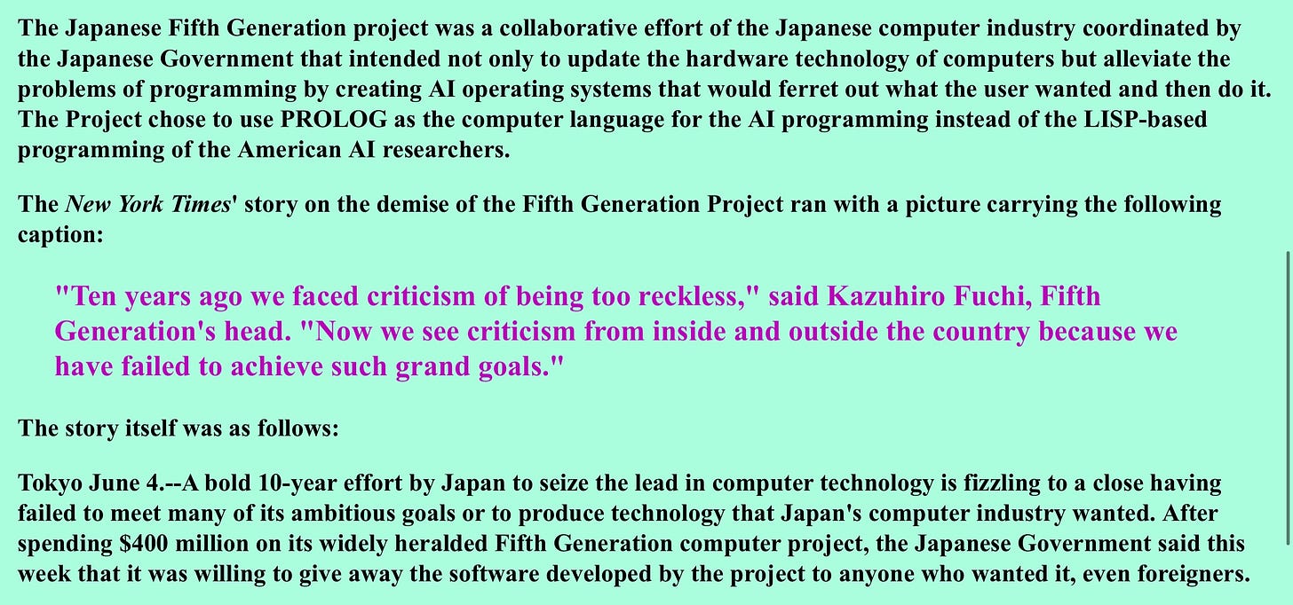 1980 年代的时候,日本政府雄心勃勃试图“超英赶美”,号称要使用 Prolog 语言来实现所谓「第五代计划」,实现「能思考的机器」。最后在花费 10 年时间和 4 亿美元的经费之后宣告失败。简要的信息可以参考这篇文章,当然我鼓励大家去寻找更多的历史线索。