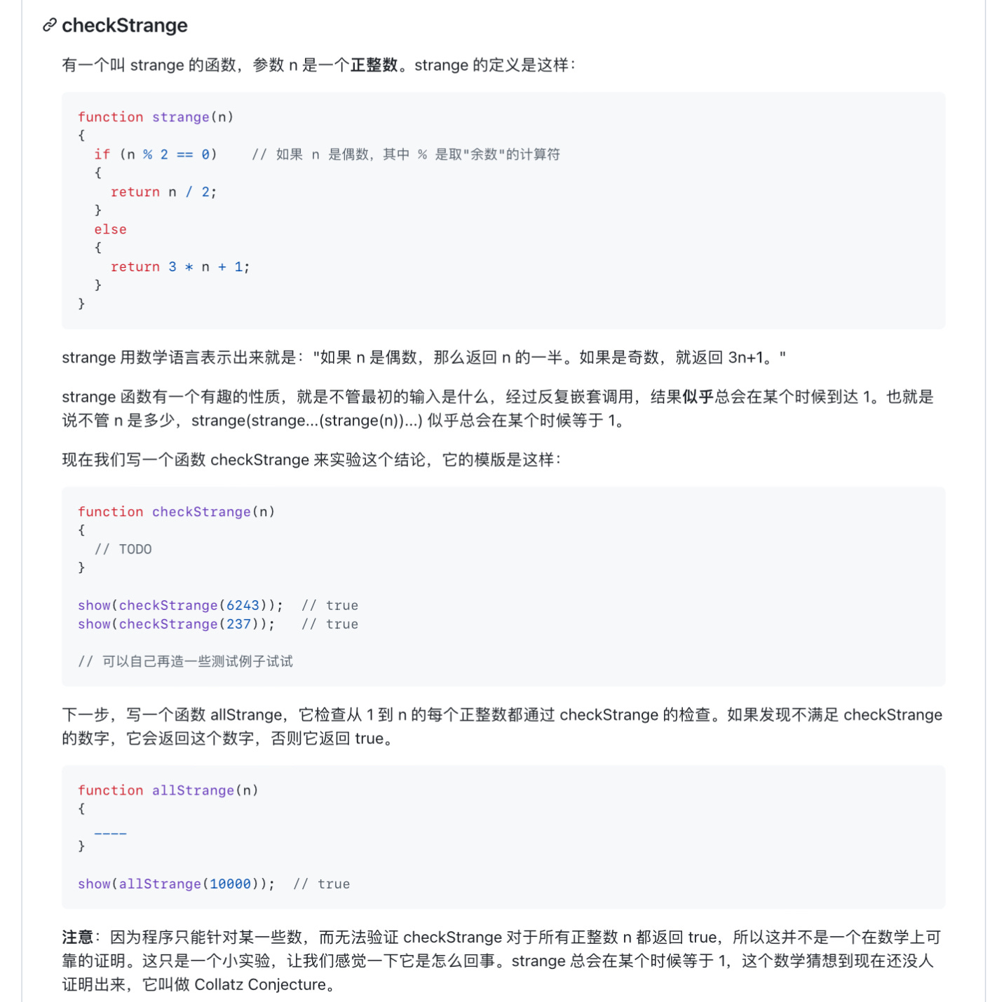 虽然我说过计算机科学基础班课程和练习里不会有复杂的数学或物理之类的例子,以至于零基础的文科同学,甚至 13 岁的少年都能顺利完成。但很有意思的是,第二课的练习里却含有至今未能证明出来的数学猜想,要求同学们实现代码来检测 Collatz 猜想。难道这不算“高深的数学”问题?