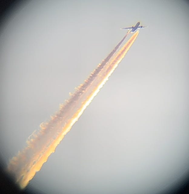 再看看,用望远镜看尾迹飞机是什么形态?这跟上面喷洒 DDT 的场面不是很相似吗?