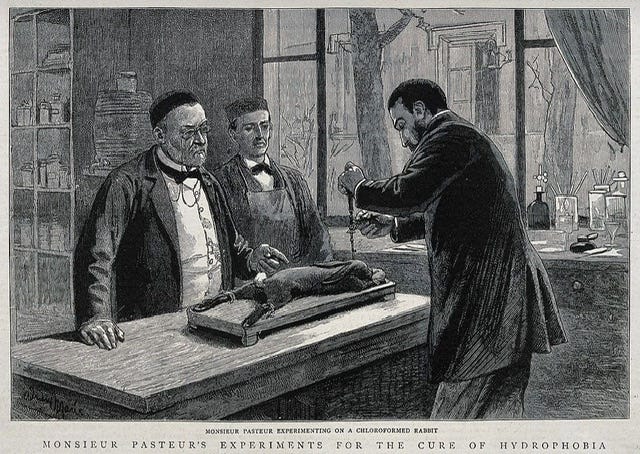 这个“实验方法”好像在什么地方见过呢?是的,“狂犬病毒”的发现者 Louis Pasteur 就是这么做的“实验”。他把“疯狗”的脑子拿出来打成浆糊,往健康狗的脑子里注射,我们小学时把这作为“科学家故事”学习过。我们被告知,这种孜孜不倦做实验的行为体现了“科学精神”。然而没人仔细思考过,他这种做法真是科学的吗?他真的证明了病毒的存在吗?