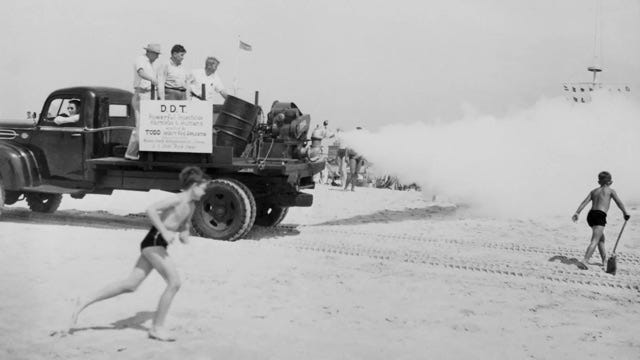 从 1940 年代一直到 1970 年代,人们是这样使用 DDT 的。下图中卡车上的牌子写着:“DDT, powerful insecticide, harmless to humans。” (原文)官方大肆宣传 DDT 对人体完全无害,所以到处喷洒,甚至直接喷在玩耍的小孩身上。