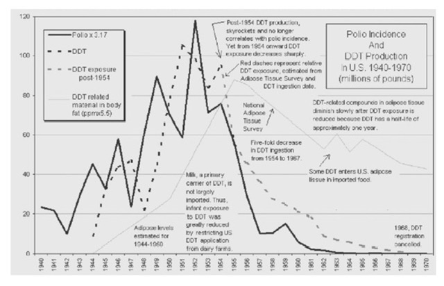 其实研究者们早就做实验发现,DDT 之类的农药可以导致和 polio 一样的瘫痪现象。而且从数据上也发现,polio 的病例是和 DDT 的使用量密切相关的,而不大可能像官方的说法那样,是因为“病毒传染”。实际上已经有人做过实验,发现患病的动物和没病的动物关在一起,没病的动物并不会被传染而得 polio。