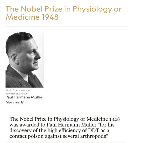 再去看看 1948 年诺贝尔医学奖发给谁了?DDT 的发明者。我没说错吧,每当 Matrix 想让人们相信什么有害的事物或者想法,就会发给它一个诺贝尔奖。