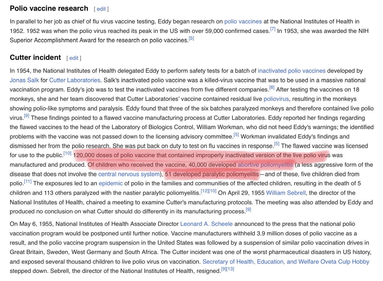 所以他们当年就是用这样的巫术方法“证明”了病毒存在,说是病毒导致了 polio,然后研制了“polio 疫苗”。结果大规模接种之后,反而导致数以万计的儿童患上 polio,瘫痪掉了。官方的解释是,某些厂商制造“灭活疫苗”的时候工艺有问题,没有“灭活”得彻底,导致活的病毒残留在了疫苗里,所以反而导致了 polio。有兴趣可以看看这个 Bernice Eddy 的故事。