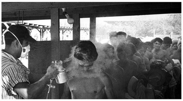 1956 年工人入境美国的时候,会被这样全身喷洒 DDT。