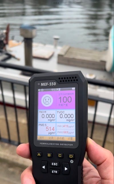 比如视频里这只船,我测过两次它附近的 pm。最高的时候达到了将近 1000!我戴着 N95 口罩,却都挡不住那个异常奇怪而刺鼻的味道,我不得不屏住呼息。跑开之后摘下口罩,需要在空气里晾好一会,那气味才能从口罩上消散。再次戴上之后,仍然会感觉到残留的味道。