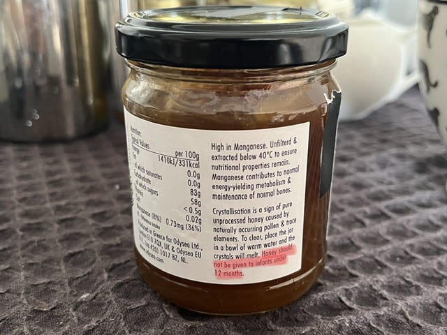 今天从超市买了一瓶蜂蜜,发现标签上写着:蜂蜜不应该给 12 个月以下的婴儿吃。(图 1)
