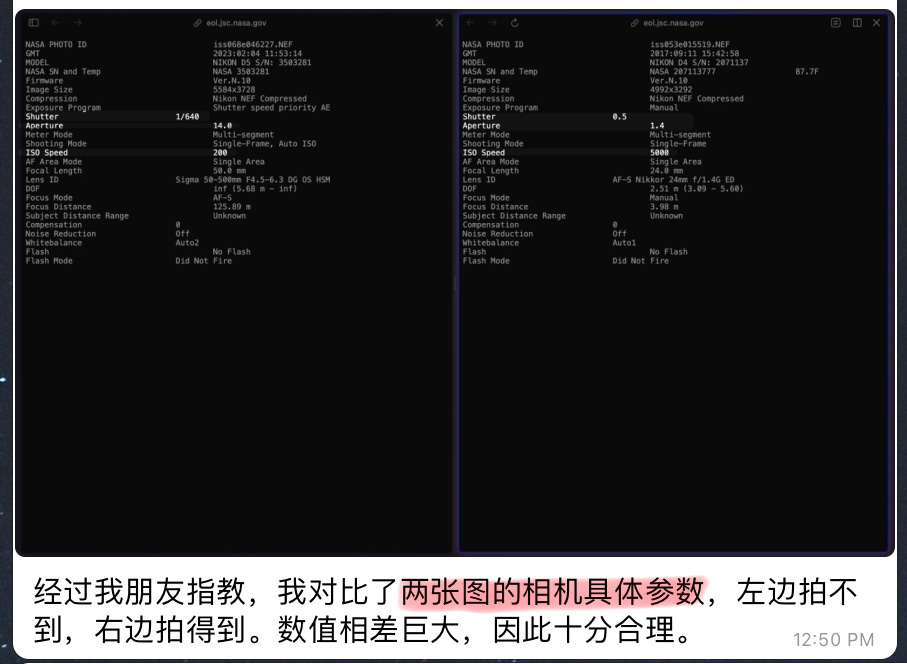 这些具体的相机配置和参数,它们的局限性,全都是 NASA 一家之言。我们现在就是要判断 NASA 是否诚实,却用 NASA 提供的配置和参数信息来进行推理,这样就不可能得到正确的结论。