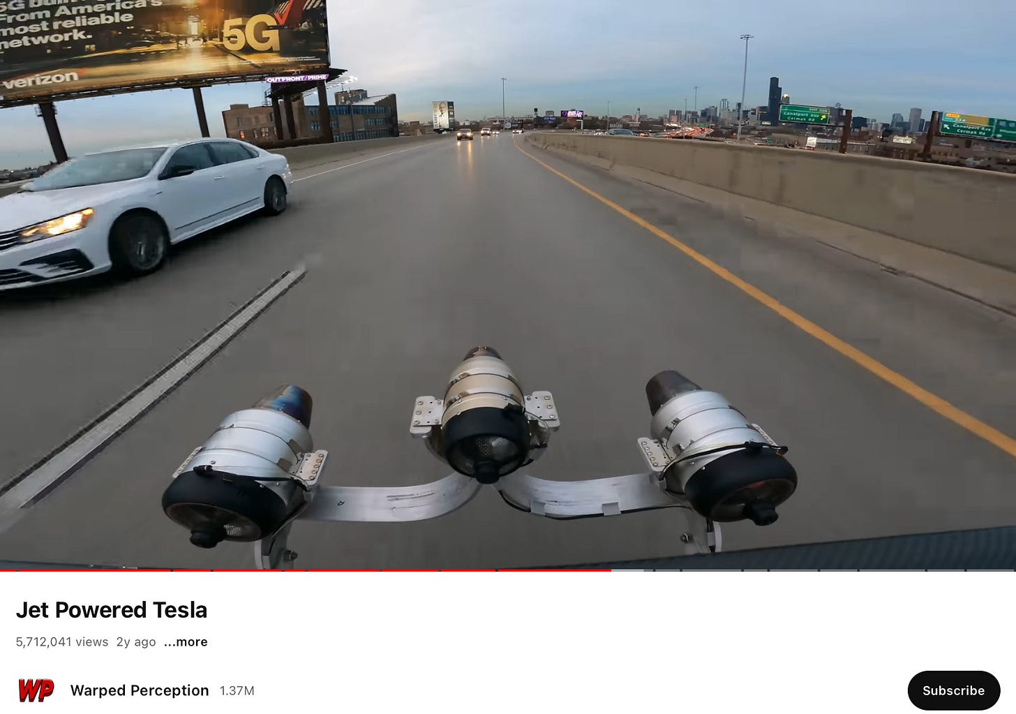 他开着装有三个喷气式引擎的 Tesla 车上了高速公路。这很容易出问题,需要很高的安装和控制技术才敢上路。我觉得一个人很难做到。喷气式引擎发出巨大的噪音,居然没被蹲点的警察发现并拦下来?这不大可能。你不觉得他是有特权的吗?只有 Matrix 可以有这样的特权,警察也只能配合他们拍片。