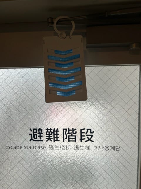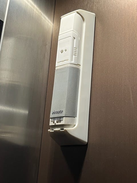 后来我坐电梯的时候,悄悄把它调到了 0 档,关掉了。但后来几天仍然闻到很重的空气清新剂气味。后来终于在安全出口处发现另一个空气清新剂装置,就挂在门上的。很显然这里面都是化学物质。