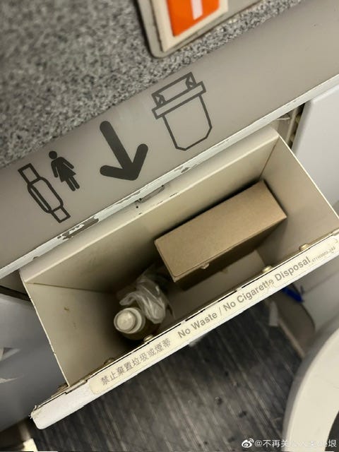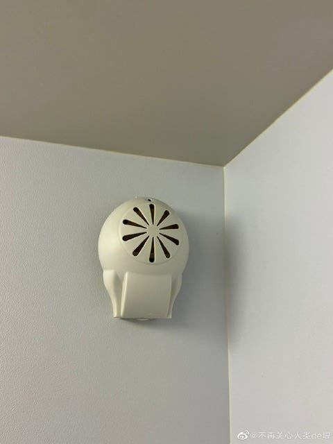 下一趟飞机是从香港飞到大阪的,也是国泰的飞机,但因为是从香港出发到日本,我觉得这一架应该没有气味了。刚上飞机的时候,确实好像没有气味,我就没戴防毒面具。过了一会,我决定去卫生间侦查一下,却发现卫生间里也是比较浓的空气清新剂气味。我又打开那个橱柜,却没有看见空气清新剂瓶子,所以这架飞机好像用了别的方式。我找了一下,发现墙壁上有一个像是香薰装置的东西,应该就是它在释放这个气味了(图 3)。