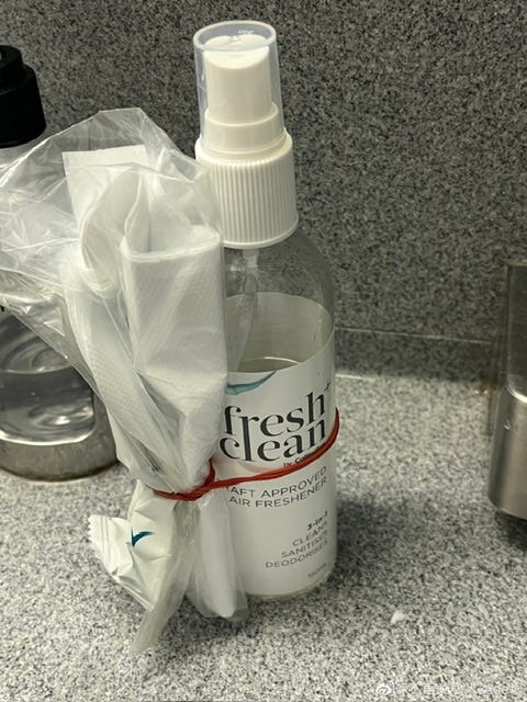 这个清新剂和之前在英国酒店里看到的 Ecolab 制造商不同,但我估计他们都是受同样的国际势力控制的。只是表面上制造商和国家不同,这样来掩盖秘密。不然为什么英国到处都是这个气味,连飞机上都是,而且在卫生间里喷洒这么多呢?本来这种冲水马桶就不怎么臭的,水一冲,排气扇一排,基本就没有了。为什么要喷这么多的空气清新剂,多得让人窒息?