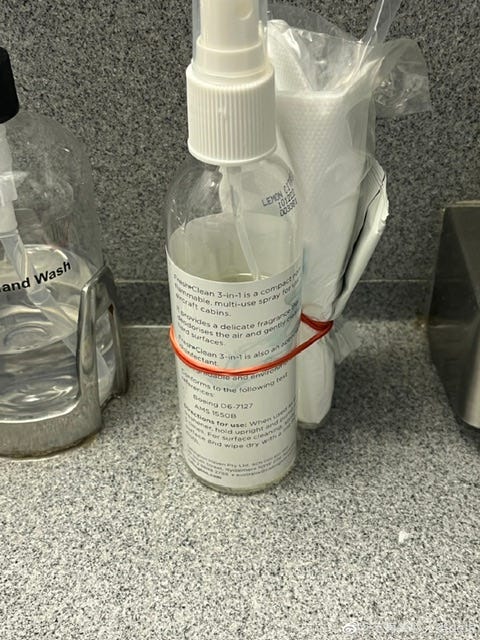 我把瓶盖拧开闻了一下,果然就是这个气味。整个机场,机舱和卫生间里都是这个气味。虽然这产品写着通过了某种“标准”,而且还因为不可燃,所以批准在飞机上使用。但这东西本来就是没必要的,为什么要在整个机场和机舱里释放这种东西呢?所以我觉得这些“标准”是在打掩护。这东西应该是有秘密的毒性,只是无法被现有的标准检测出来而已。