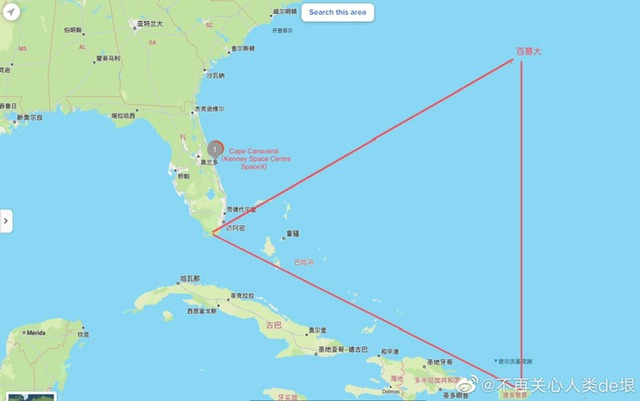 肯尼迪航天中心那个地方,正好在“百慕大三角”附近,所以大概就是掉进“百慕大三角”了(图 1)。为什么有“百慕大三角”的传说,说很多船只和飞机经过“百慕大三角”,就莫名其妙地消失了,再也找不到?现在大概想明白了,因为那片海里坠落了很多的“火箭”,不能让人看见。所以编造了这个“百慕大三角”的传说,然后让军舰和战机在附近巡逻,以“安全”为理由不让其它船只和飞机靠近这个区域。