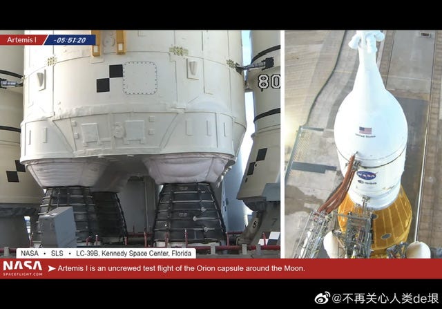 总之,普通的火箭是可以给人现场观看发射的,只是最后都没去太空。但是 Artemis 1 这个 SLS 火箭特别大特别重,飞不起来。仔细看看这火箭和飞行器的做工吧,粗燥得完全不符合空气动力学的需求(图2,3,4)。