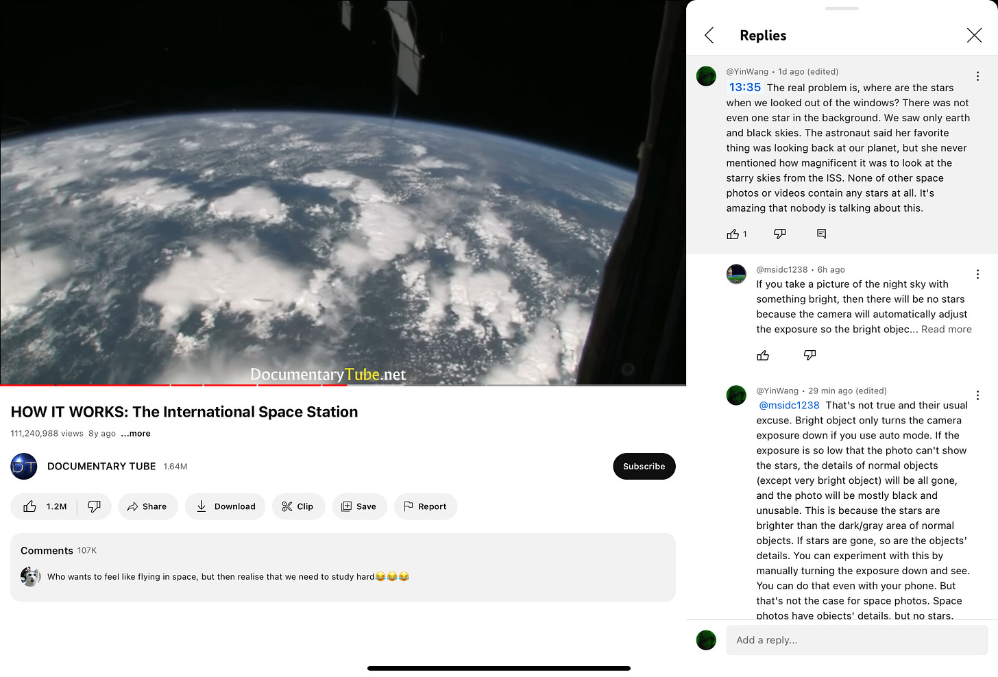昨天,我在之前提到的“国际空间站参观视频”里写了一条评论,指出从窗口看出去一颗星星也没有。不出所料,今天就有人回复我,说那是因为相机在有很亮物体的情况下会自动调节曝光,所以就照不到星星了。这种说法我已经看了不知多少遍。