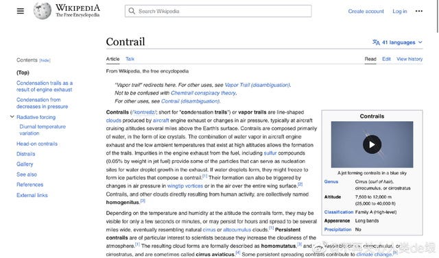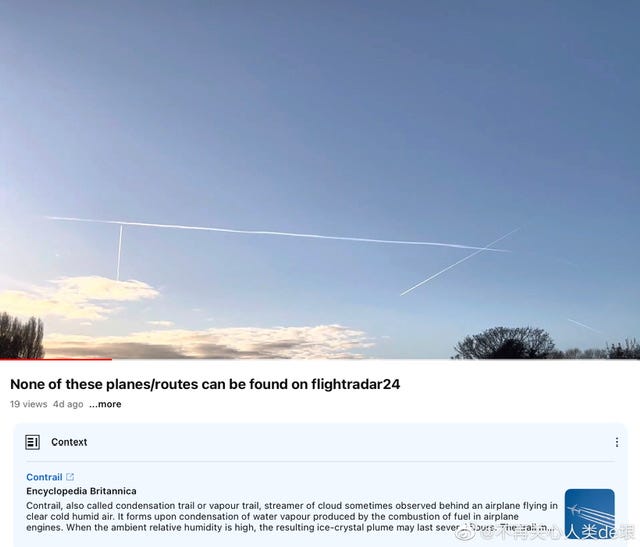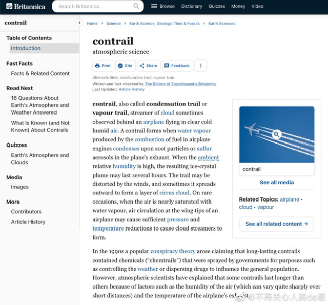 昨天对「凝结尾迹」(contrail)和「化学尾迹」(chemtrail)的分析之后,我发现 YouTube 给我的视频加上的“context”,那个大英百科全书讲「凝结尾迹」的网页,上面的照片居然是「化学尾迹」的照片。
