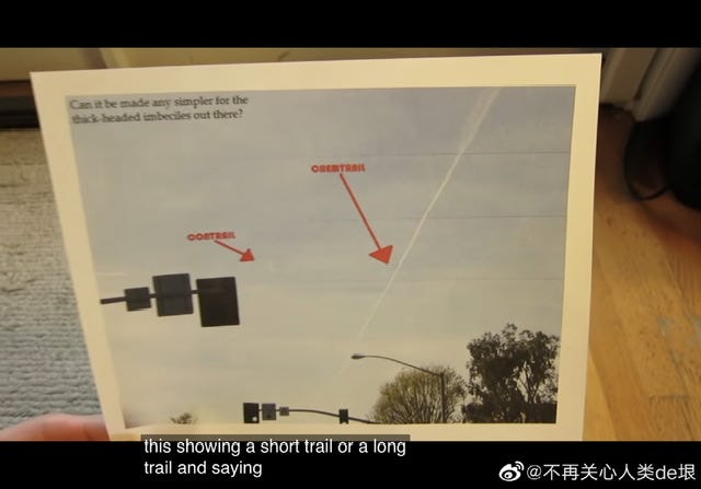 另一个常见的心理技巧,就像之前那个视频里的,把短的尾迹说成是「凝结尾迹」,把长的说成是「化学尾迹」。而其实不管短的还是长的,都是化学尾迹。只要那个尾迹很明显,比飞机本身还要长,那就是化学尾迹。