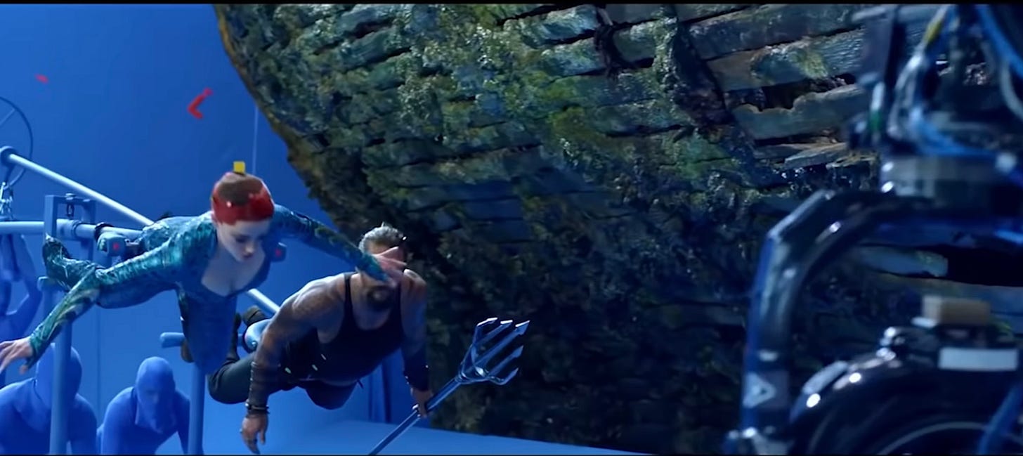 背后放上绿幕,装置涂成绿色,操作人员穿上绿衣服绿头套,这样后期软件就能自动处理,把它们消去,替换成背景了。