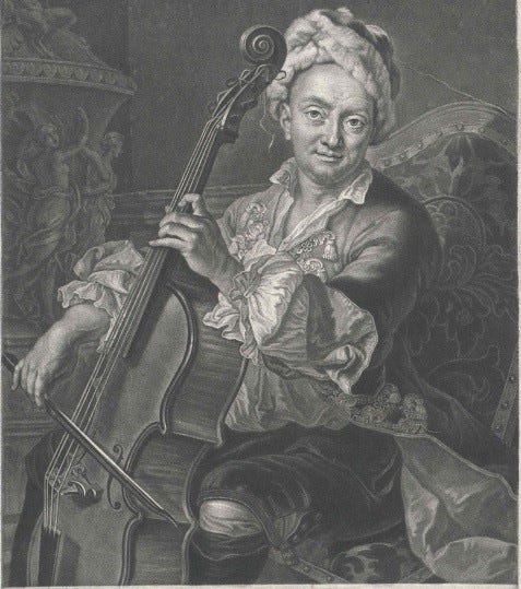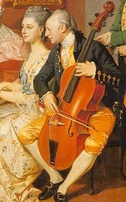 比如这幅画里,是 18 世纪意大利作曲家和大提琴家 Luigi Boccherini。你会发现那个时候使用大提琴的姿势跟现在的很不一样,而且相比现在的姿势有好几个优点。