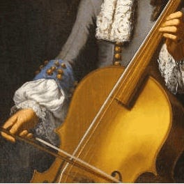 仔细看看这些历史画作里,人们拿弓的姿势(包括拇指),而且有很多人手是拿在弓下面的,跟二胡似的。在那个年代,几乎一半的人是这样握弓的。为了理解这些姿势,我买了一个巴洛克式琴弓,并且试了这个握法,发现比起拿上面的握法在某些时候有优势,当然也有缺点。人可以选择自己喜欢的握法,但很多大提琴家恐怕从来没试过这些做法,因为老师告诉了他们什么是"正确姿势",连拇指要弯曲这个事情都规定了。