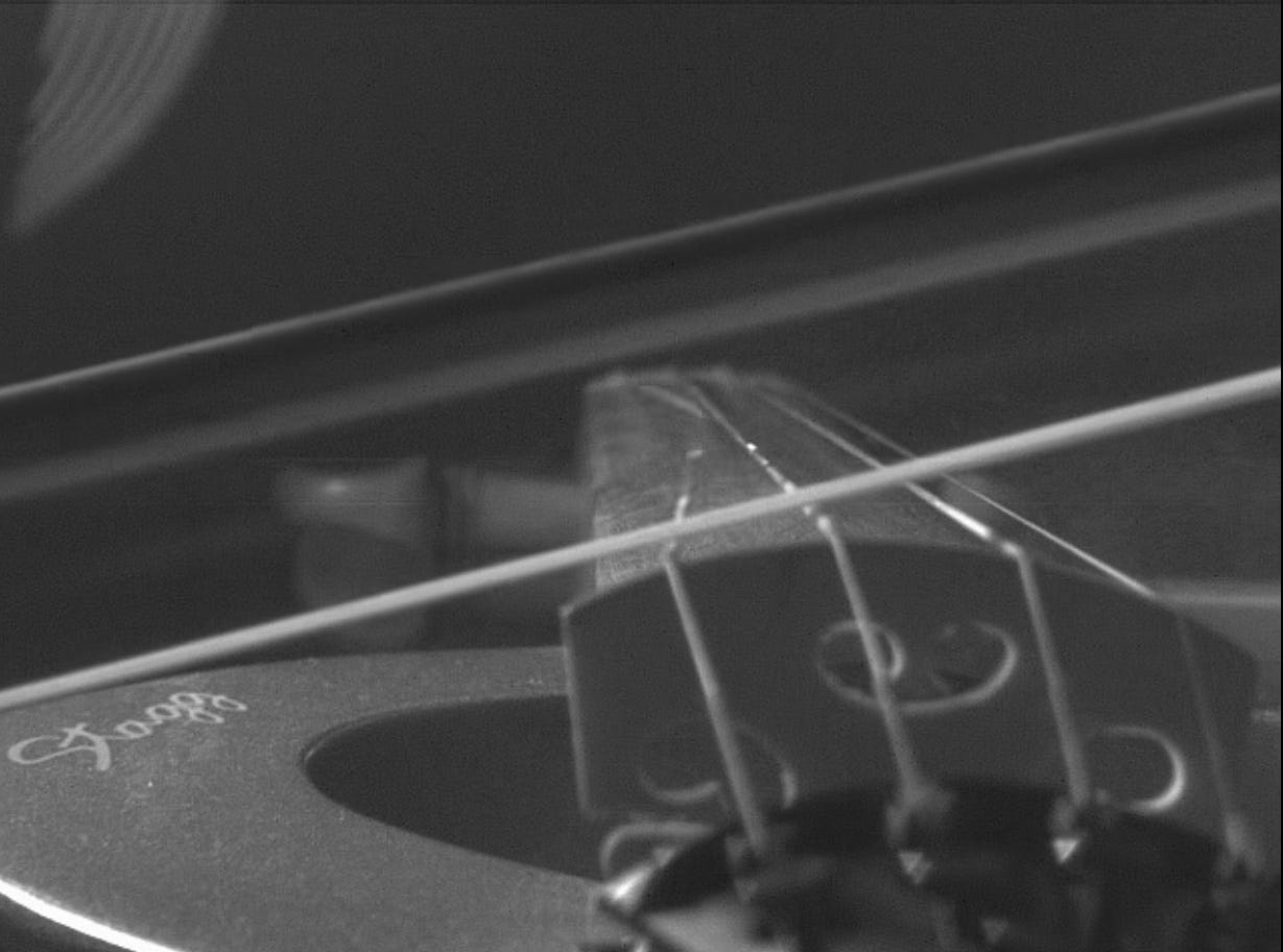 如果你仔细观察被弓拉动的琴弦的振动,就会发现它不是在平面上来回振动,而是绕着一根中轴在转,形状是很扁的椭球形,像一些旋转球,或者更贴切点,像一根长跳绳。被琴弓拉动的琴弦和被手拨动的琴弦的振动方式是不一样的,前者是椭球形在旋转,后者只在平面上来回。