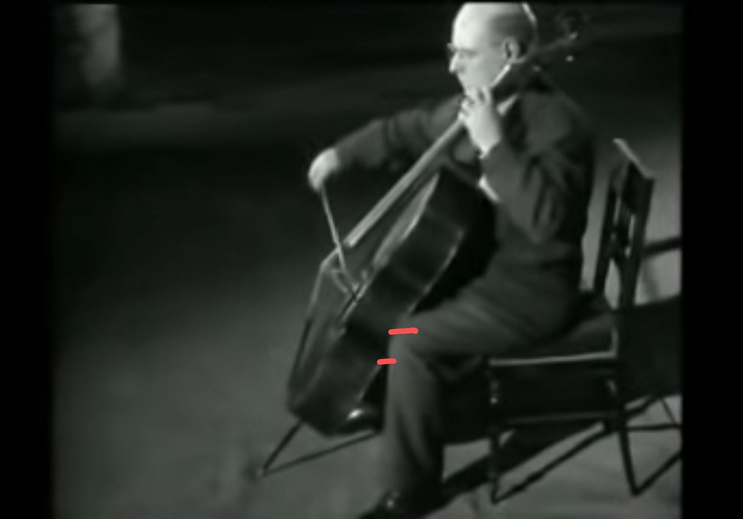 其实只要多看一些顶级大提琴家的表演视频(比如 Pablo Casals)就会发现,他们很多人都没有遵循这些教条,用什么姿势的都有。Casals 的小指经常不在弓杆上,就算有时候在弓杆上,也不在那个"眼睛"的地方。而且他的琴放得很低,这也违反了一些人的"标准高度",说琴的那个角要正好在膝盖的高度。