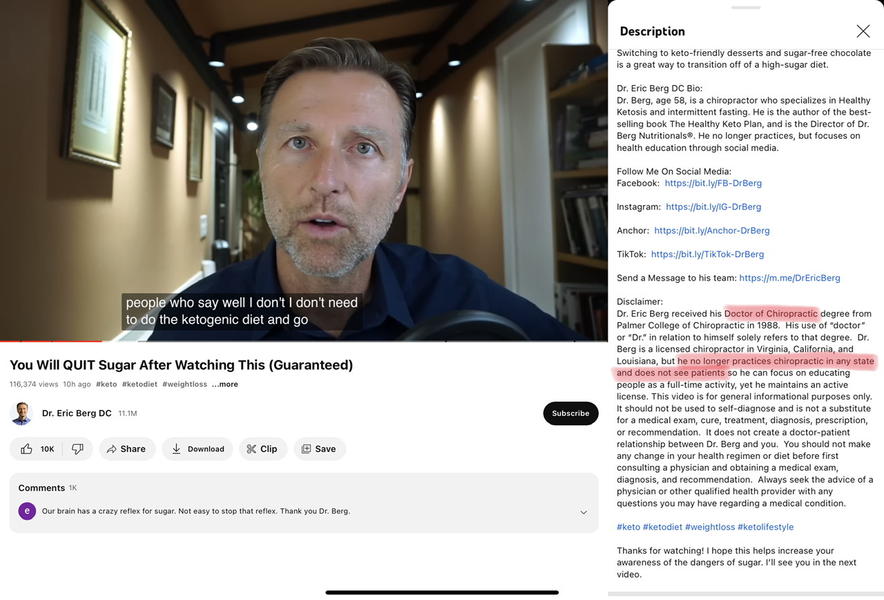 所以回到 Dr Berg 这个例子,做一个类比,也许你会发现 Dr Berg 其实演出的是类似 Trump 的角色。Dr Berg 本来就是一个骗子。虽然叫自己 Dr,但他并不是一个 MD 医生,而是一个 DC(chiropractor),而且很多年没有行医了(根据他的自我介绍,如图红线处)。