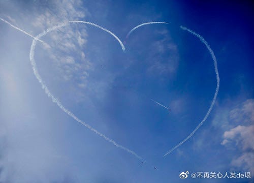 但飞机喷油确实会造成类似的尾迹,这个原理是没错的。飞行表演的时候,一般都会有飞机喷油,在空中画出一些图案(图 4)。这说明什么呢?只有飞机特意喷出里面运载的物质,才能产生明显的尾迹。所以看到天上飞机有尾迹,那么一般都是故意喷了东西出来,而不是引擎自然产生的水汽凝结。