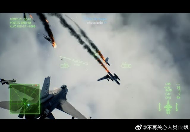 仔细看看那个“Su-27 战机”,就是个 3D 模型。尾迹和背景天空里的云也很假。无人机的那个“准心”框子,是用什么作图软件画的,画笔都用错了,颜色不均匀。玩过电子游戏的人应该都能看明白,这个动画效果还不如 PlayStation 上的《Ace Combat》(图 3)。看看游戏里实时渲染的云,烟雾(尾迹),火焰,飞机的质感,雷达显示的清晰度。几乎每一项都超过这“新闻视频”。😄