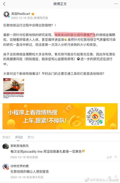 之前我说过伦敦地铁里面有严重的颗粒物污染,我觉得是在故意放毒(图 1,http://t.cn/A6C3soAN)。结果有人就找到一些微博,这些微博说伦敦地铁里确实污染严重,说这些颗粒物是“地铁发动时部分组件摩擦产生的细微金属颗粒”,还有一些其它类似的说法。
