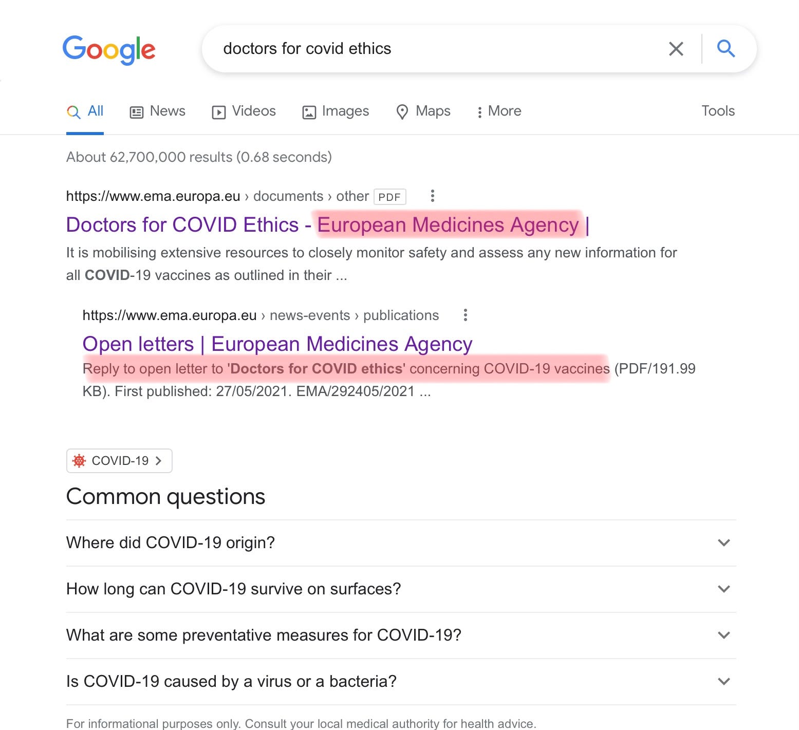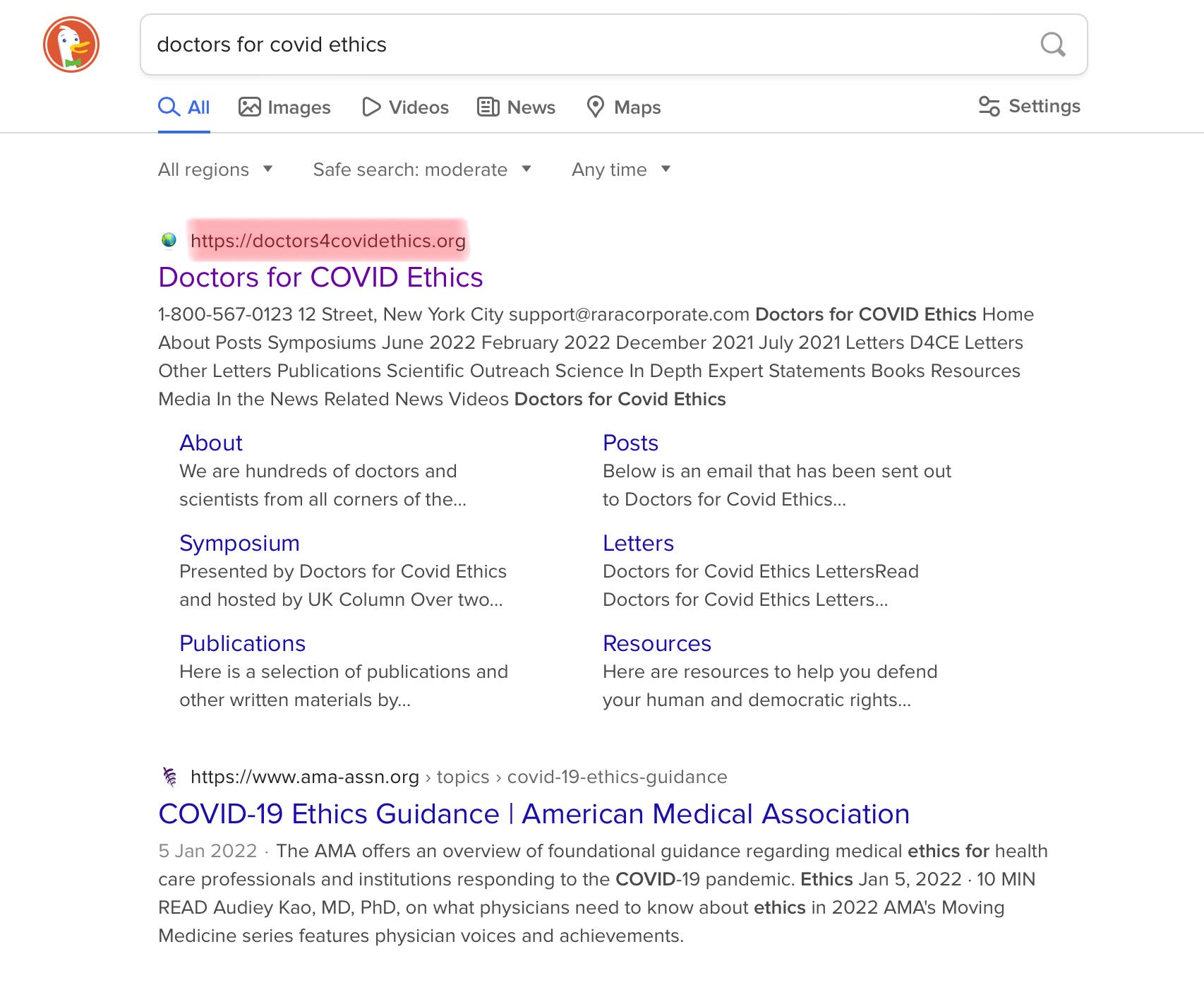 一个重要的经验,如果你想搜索关于新冠疫情的信息,使用 Google 都是不可靠的。试试搜索"Doctors for Covid Ethics"(一个全世界医生讨论新冠疫情真相的组织,简称 D4CE),Google 的前几页都不会出现 D4CE 的主页,排在第一位的是一封 EMA 反驳 D4CE 的指控的信。而 DuckDuckGo 却会把 D4CE 的主页列在第一位。