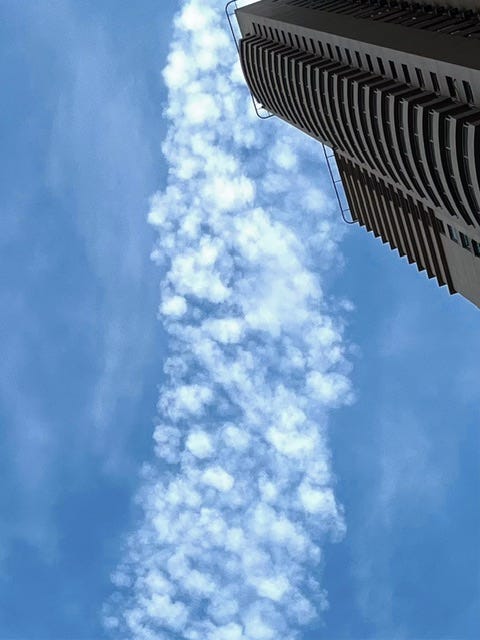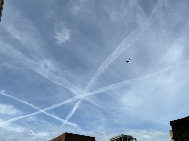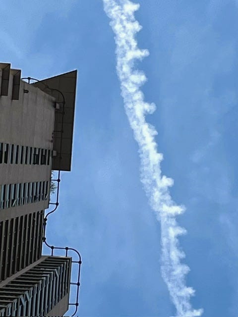 我开头以为这就是水汽而已。实际上,前一天刚有人跟我说过“化学尾迹”(chemtrail)的事,我还嘲笑他那是“阴谋论”,没想到第二天我就亲自看到这尾迹。