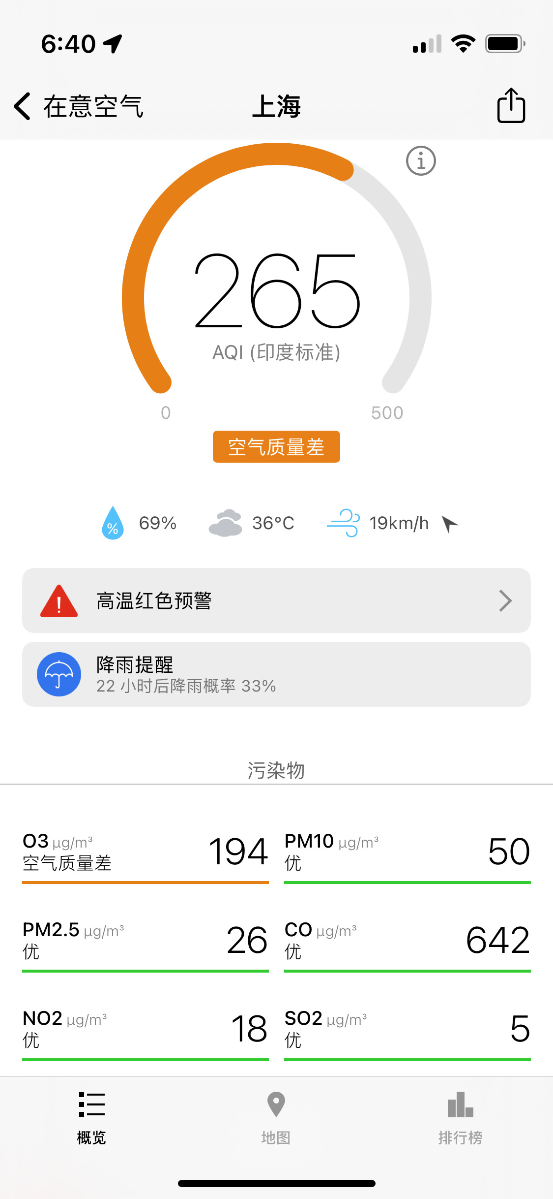 接下来我注意到,每当看到尾迹飞机,「在意空气」就会显示臭氧(O3)浓度很高。下面是我去年看到尾迹飞机之后的截图,可以看到 O3 浓度严重超标,而且气温达到了 36 度之高。