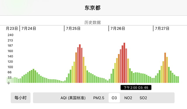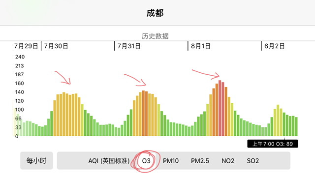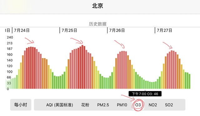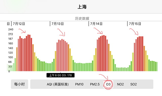没想到一年之后,这个观察帮助我发现了为什么目前出现了“全球极端高温”。如果你看一下「在意空气」的 O3 历史记录,就会发现几乎所有城市都是类似的,每天 O3 都会升高到“严重污染”(红色)的程度。
