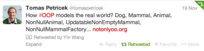 "Everything is an object" is the core dogma of OOP and deemed as the highest standards of OO language design. Now let's take a careful look to see if it is true, or if it is a good idea to make things that way. Many people take "everything is an object" for granted because when this sentence is taken literally it matches their everyday experience. Since the word "object" in English basically means "a thing", how can "everything is an object" be not true? But be careful since the definition of an "object" in OOP has a specific meaning which is very different from its meaning in English. OOP's definition of an object is "a combination of data fields and associated procedures known as methods". Can you really fit everything into this model? First let's look at the real world and see if this definition can capture everything. Cars, trees, animals may sometimes be thought of as objects, but what about a change of the objects' position, its velocity and duration? What methods do they have? Well, you may define classes called Velocity or Time, with methods such as addition, but do velocity and time really contain the things that you call "methods"? They don't. They are just your imagination. You can add the velocities or time, but how can velocities or time contain the addition procedure? This is like saying that the bullets contain the gun. So the most you can say is that "everything is an object" is a good way of thinking, but that is not true either. The definition of an object implies that a method can only belong to one object, but most of the time it doesn't make sense thinking of it as belonging to any object. Say we have the expression 1+2, does the operator '+' belong to 1, or does it belong to 2? You have to make some arbitrary choice. Since you can make a choice, this means that the '+' operator doesn't really belong to either of them. The operation is inherently outside of the objects. So thinking of some things as objects may be helpful, but thinking of everything as an object is neither true nor useful. Unfortunately "everything is an object" has been taken as a dogma and the highest standard of OO language design. Some OO languages claim that everything is an object in them. Whenever you notice that something is not an object, somebody will try to make it one. They may succeed in that, but things get very complicated that way, because that's not how things work. The idealism of "everything is an object" is similar to "everything is a function" in the functional programming world and "everything is a set" in the math world. Before computer science was conceived there was a thing called the lambda calculus. Some people encoded everything including numbers and their operations, various data structures and control structures, ... all in lambdas. One of the encodings of numbers is called the Church numeral. Every programming language researcher has played with them during their education. But unlike "everything is an object", "everything is a function" has never become a dogma or marketing phrase. Those formulations sometimes provide thought experiments and inspirations to the researchers but nobody really use them for actual computation, because they are inefficient and they are not really how things work. They are just approximations (models) to some essence of computation that we can't see. If you really use them for practical projects, things become complicated. Mathematicians have a similar concept: set theory. Some geniuses encoded everything -- numbers, operations on numbers, mathematical structures, ... all in sets. Everything is just sets containing sets containing sets and so on. What's the problem? But when they really tried to do their proofs using those sets, the proofs fell under their own weights. They are too complicated. Even with the complexity, set theory is not expressive enough to capture whatever the mathematicians have to say. Many people tried to fix it, but they all failed. So "everything is an object" is in some sense on the same track of "everything is a function" and "everything is a set". Good thought exercise, but doesn't really work well in practice. I don't think that there is some "one true language". When compared to the "absolute truth" every theory is wrong, but some theories are more wrong than others. The model of OOP is too far from correct or practical. It's somewhat like the flat earth theory. Until today some people still believe that the earth is flat and make all kinds of theories to prove it. Some of their arguments look very scientific, but do you believe in their formulas or a picture of the earth from a spaceship? When you get the fundamental things wrong and don't throw them away, you have to patch them endlessly with even more complicated theories. You will have to make theories that bend the light and gravity in weird ways. And that's what happened to OOP.