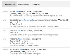 Two weeks since joining, I have successfully integrated PySonar2's type inference and indexing features with Sourcegraph.com, so that it can now show inferred types for Python functions. This is an advanced feature currently not available in any Python IDE. For example, the following is the "Top Functions" page for the Flask framework, showing the PySonar2 inferred types. Notice that the parameters are not type-annotated. PySonar2 infers the types by an advanced interprocedural analysis.