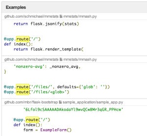 (The above picture was taken from: http://sourcegraph.com/github.com/mitsuhiko/flask) I recently joined a newly founded company called Sourcegraph.com. We build an intelligent code search engine using some of the most powerful programming language technologies. The difference between Sourcegraph and other code search sites is: Sourcegraph truly understands code and produces accurate results. Sourcegraph lets you semantically search and browse opensource code on the web in a similar fashion as you do locally with IDEs. It also finds users of your code worldwide, and show exactly how they use your code. For example the following is what Sourcegraph shows you about Flask framework's Flask.route method.